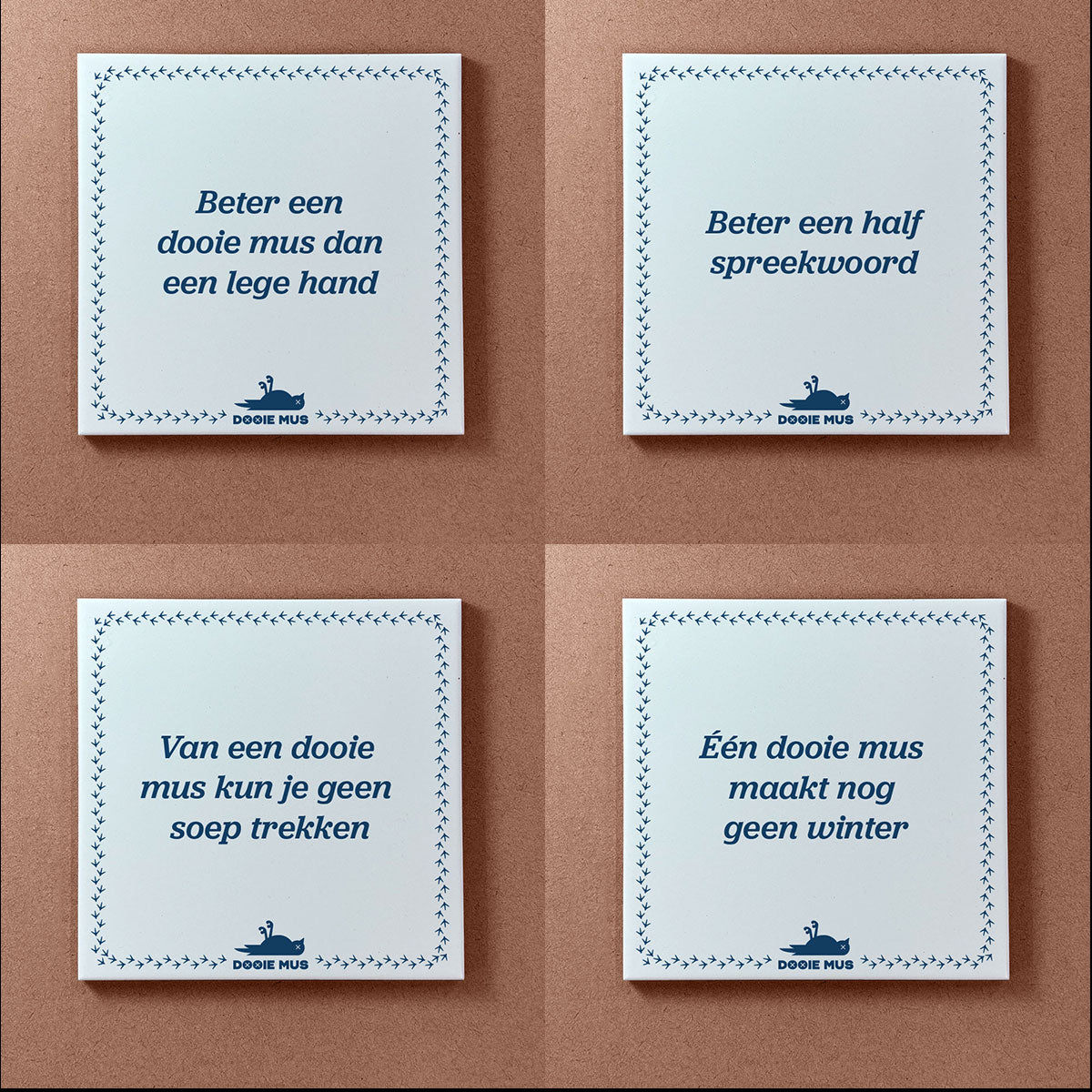 We redden ze, poetsen ze op en voorzien ze van onze eigen spreekwoorden. Je koopt niet alleen decoratie; je koopt een circulaire eye-catcher met een glimlach. Elke tegel is duurzaam, en hilarisch.